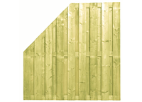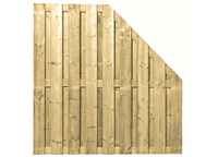 Dit hoekscherm is stevig, robuust en veelzijdig. Het is gemaakt van groen geimpregneerde vuren planken van 1.7x14cm. De 17 staande planken bieden voldoende privacy en worden met 3 stevige klampen van 1.8x9cm bij elkaar gehouden. De middelste klamp zit bij deze schermen netjes op dezelfde hoogte als de rechtscherm 17 pl.-schermen waardoor het mooi doorloopt bij een combinatie. De schermen zijn RVS geschroefd. De afmeting is 180x180 en de afschuining zit op 90/90cm. De zijde waar de afschuining zit, bepaald de benaming links (L)inks of (R)echts. Voorbeeld; De R verticaal kan ook als L horizontaal gebruikt worden.