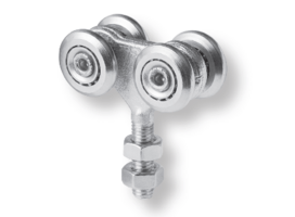 Bovenop de schuifpoort worden 2 verstelbare bevestigingsplaten gemonteerd. Het draadeind van het loopwielblok kan in die bevestigingsplaat gedraaid worden. De gelagerde wielen rollen door de rail waardoor de poort gemakkelijk heen en weer geschoven kan worden. Je hebt per poort 2 loopwielblokken nodig.